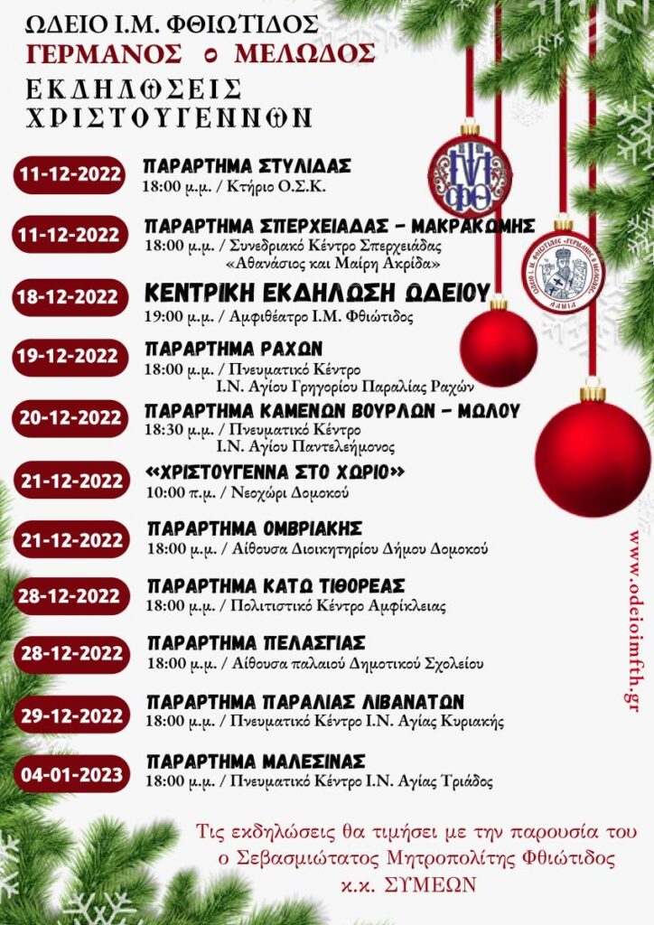 Οι καθηγητές και οι μαθητές του Ωδείου της Ιεράς Μητροπόλεως Φθιώτιδος «ΓΕΡΜΑΝΟΣ ὁ ΜΕΛΩΔΟΣ», μας εισάγουν στην μυσταγωγία των Χριστουγέννων, με εκδηλώσεις στην πόλη της Λαμίας και σε όλα τα παραρτήματα του Ωδείου.
