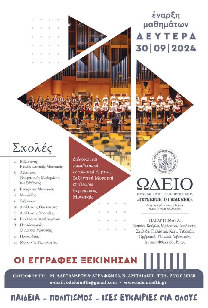 Μὲ τὶς εὐχὲς καὶ τὶς εὐλογίες τοῦ Σεβασμιωτάτου Μητροπολίτου Φθιώτιδος κ. Συμεών, ξεκινᾶ τὸ νέο ἀκαδημαϊκὸ ἔτος 2024 – 2025 γιὰ τὸ Ὠδεῖο τῆς Ἱερᾶς Μητροπόλεως Φθιώτιδος «ΓΕΡΜΑΝΟΣ ὁ ΜΕΛΩΔΟΣ», τὸ ὁποῖο στεγάζεται σὲ αὐτόνομη πτέρυγα τοῦ Πνευματικοῦ καὶ Διοικητικοῦ Κέντρου τῆς Ἱερᾶς Μητροπόλεως.